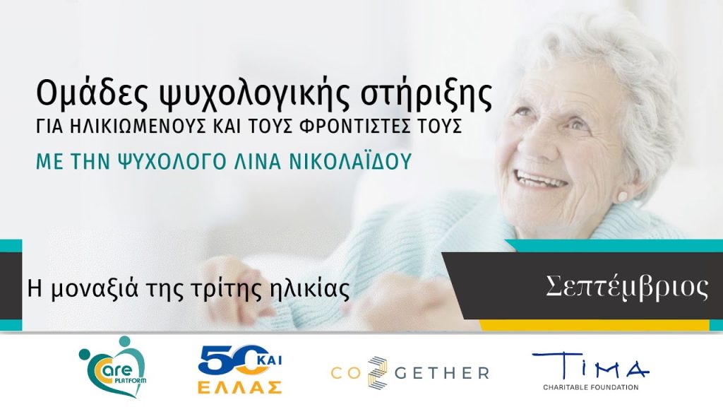 Στο πλαίσιο του προγράμματος της Care Platform από την 50+HELLAS και την Co2gether, πραγματοποιήθηκαν οι ομάδες ψυχολογικής στήριξης με συντονίστρια την ψυχολόγο κα. Νικολαϊδου Λίνα. Σε αυτό το video, μπορείτε να ενημερωθείτε για την κοινωνική απομόνωση που αντιμετωπίζουν τα άτομα της τρίτης ηλικίας, είτε από επιλογή τους, είτε όχι και της μοναξιά που νιώθουν. Παράλληλα, προτείνονται στρατηγικές αντιμετώπισης.