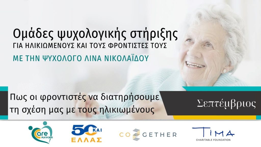 Στο πλαίσιο του προγράμματος της Care Platform από την 50+HELLAS και την Co2gether, πραγματοποιήθηκαν οι ομάδες ψυχολογικής στήριξης με συντονίστρια την ψυχολόγο κα. Νικολαϊδου Λίνα. Σε αυτό το video, μπορείτε να ενημερωθείτε για τις δυσκολίες που αντιμετωπίζουν οι φροντιστές και οι ηλικιωμένοι στις διαπροσωπικές τους σχέσεις καθώς, και σε τρόπους με τους οποίους μπορούν να τις γεφυρώσουν και εξομαλύνουν.