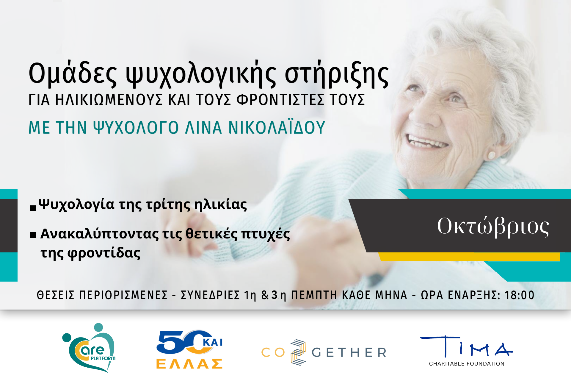 Στον απόηχο του εορτασμού της Παγκόσμιας Ημέρα των Ηλικιωμένων, σας ενημερώνουμε πως οι ομάδες ψυχολογικής στήριξης για το μήνα Οκτώβριο, έχουν προγραμματιστεί να γίνουν: